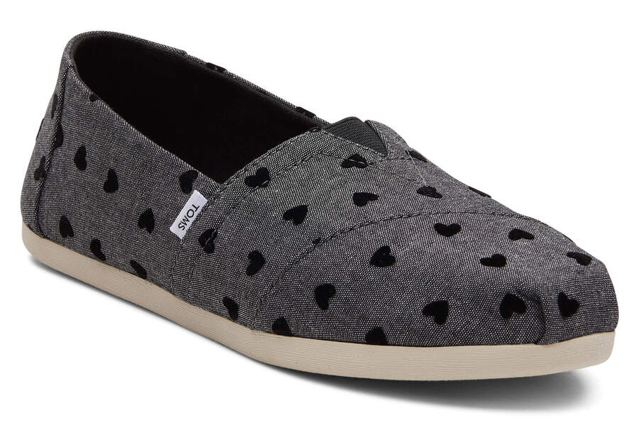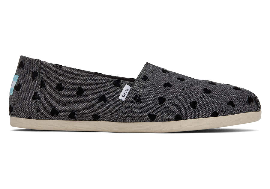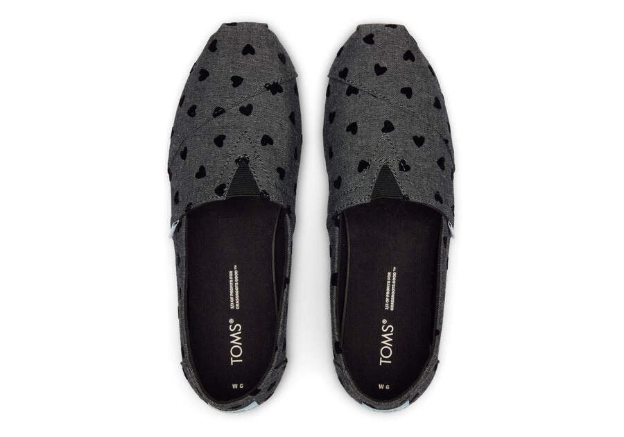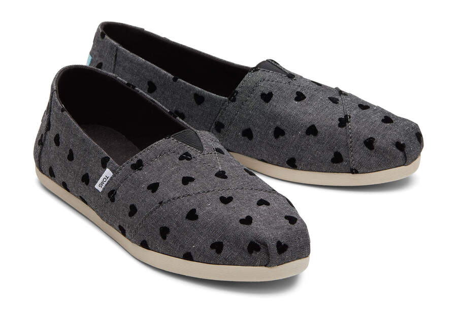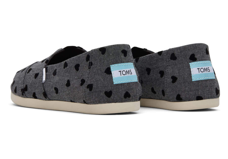 Loving is easy in these black chambray heart print Alpargata espadrilles—exclusive to TOMS.