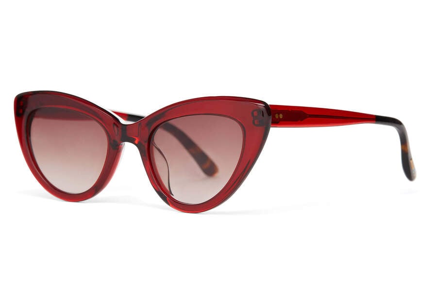 Leave it to Willow, these sleek cat eye sunglasses with a red acetate frame and a sloping browline, to add some attitude to any ensemble.